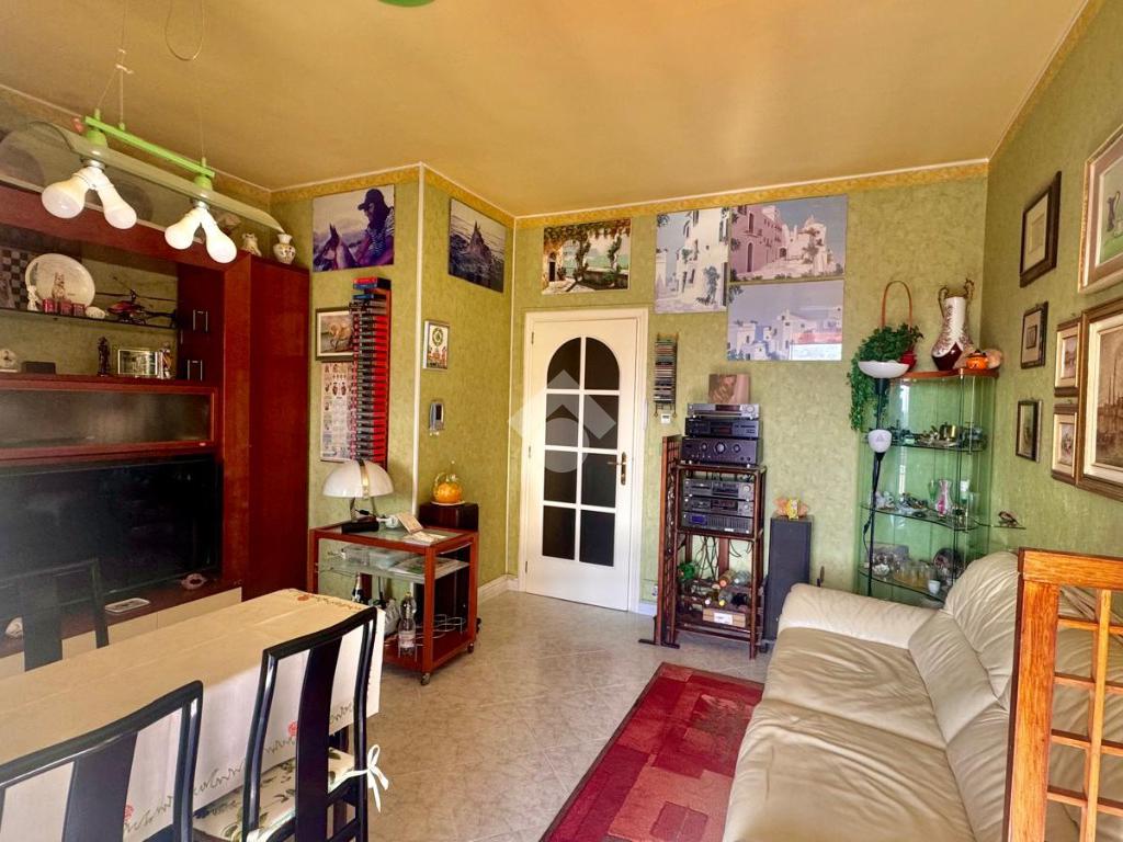 L’appartamento è composto da un ampio ingresso che dà l’accesso a tute le stanze. La zona giorno è composta dal tinello con porta finestra che dà l’accesso al primo balcone dotato di tende che affaccia sull’interno del cortile e dal cucinino, finestrato, diviso da una porta scorrevole a vetro.